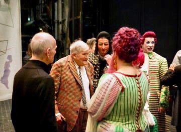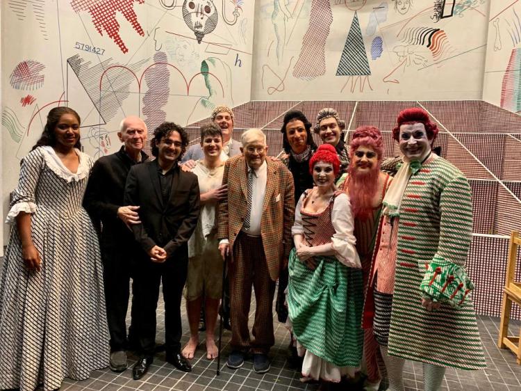 with John Cox and David HockneySpeaking with David HockneyCast Photo with Conductor, Kerem Hasan; Director, John Cox; and Artist & Designer, David HockneyIn Baba’s SedanReady for AuctionBaba’s SedanAuction Scene RehearsalBaba and her Great Auk